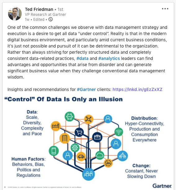 Ted Friedman, VP Research at Gartner, shared an interesting view on data in a recent Linkedin post: